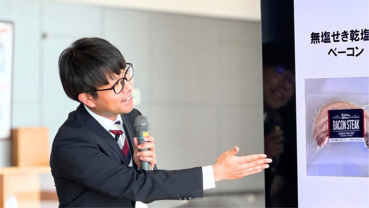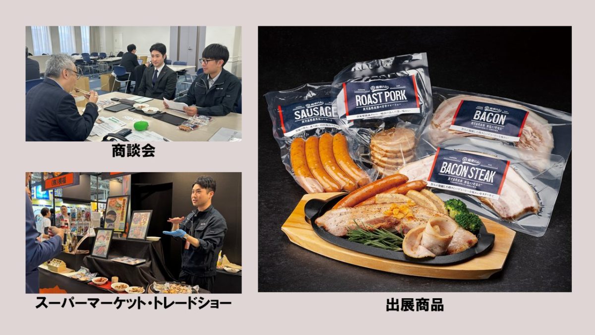 谷山港に工場があり従業員数が 30 名ほど、事業内容としてソーセージの生産販売を行っています。今回の事業では昨年度この事業のブラッシュアップコースで商品開発していた3商品「無塩せきベーコン、鹿児島県産黒豚ソーセージ、鹿児島県産チャーシュースライス」で出展しました。